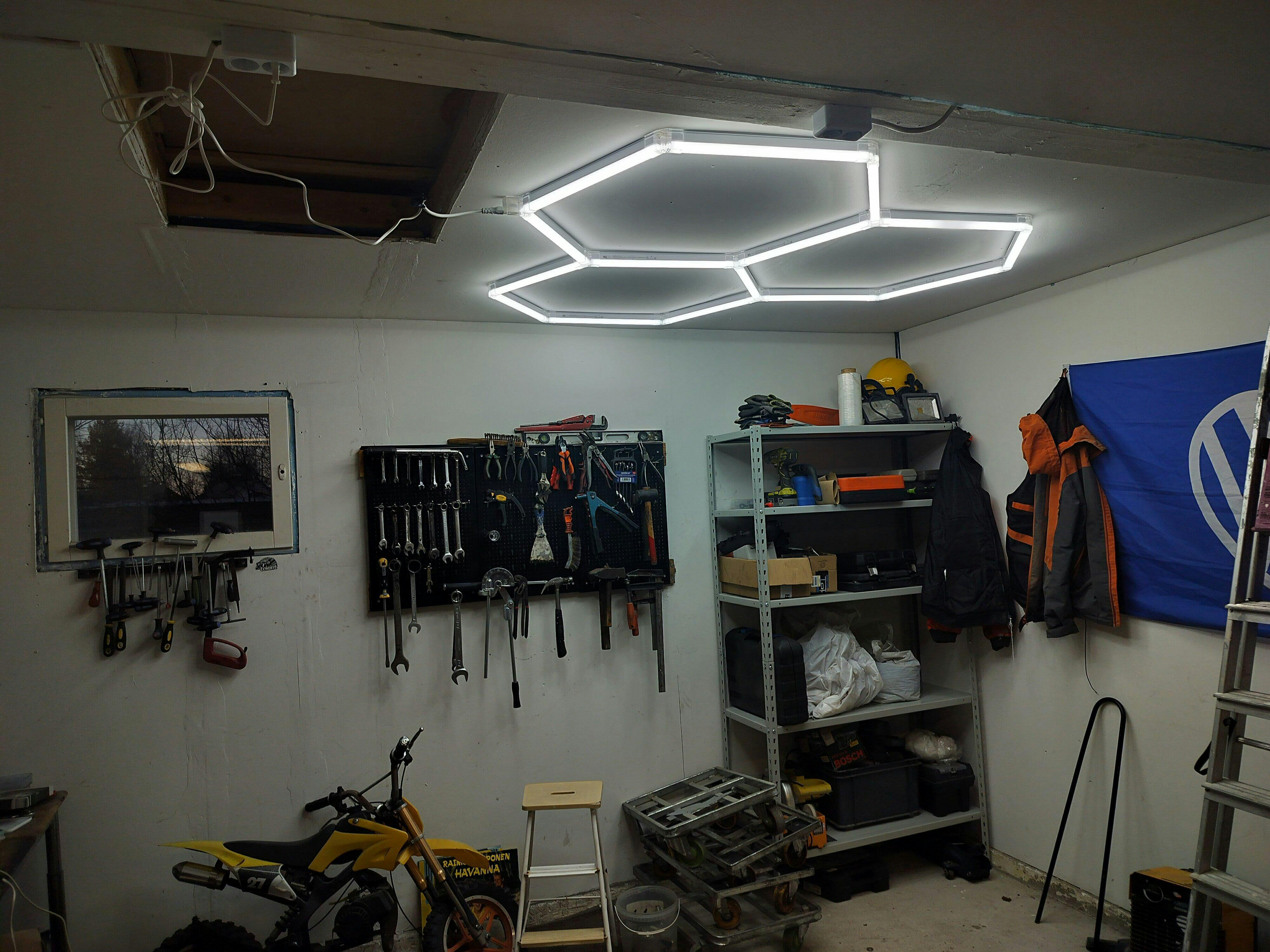 "Kattoon kiinnittäminen oli helpompaa kuin ennakoin, koska häkkyrä oli kevyt. Valoteho on just niin hyvä kuin toivoinkin. Autotalli piti siivota ja tyhjentää roinasta asennuksen jälkeen, koska aiemmin hämärien nurkkien sotkut tulivat näkyviin."